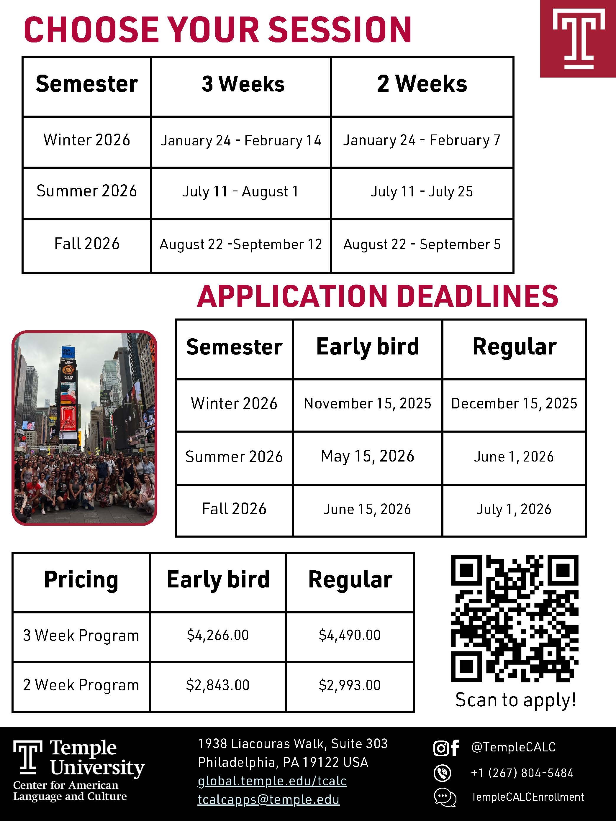 歡迎直接透過上天普語言中心 (TCALC) 官網報名:https://global.temple.edu/english-programs/our-programs/programs-undergraduate-pathway-students/american-culture-temple