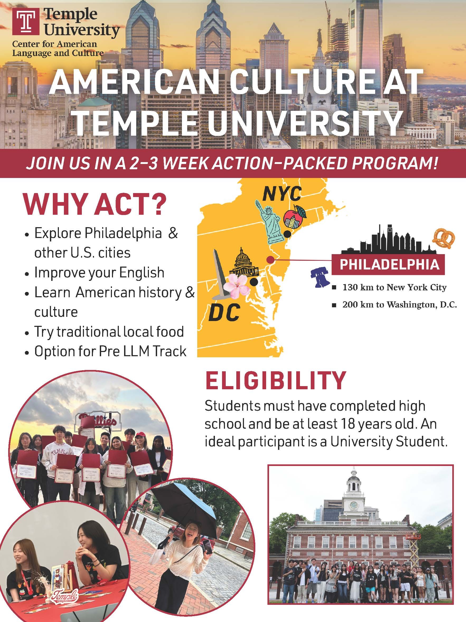 在規劃寒假計畫的同時,別忘了——Temple 大學「美國文化體驗課程(American Culture at Temple, ACT)」的早鳥報名截止日正在倒數中!
