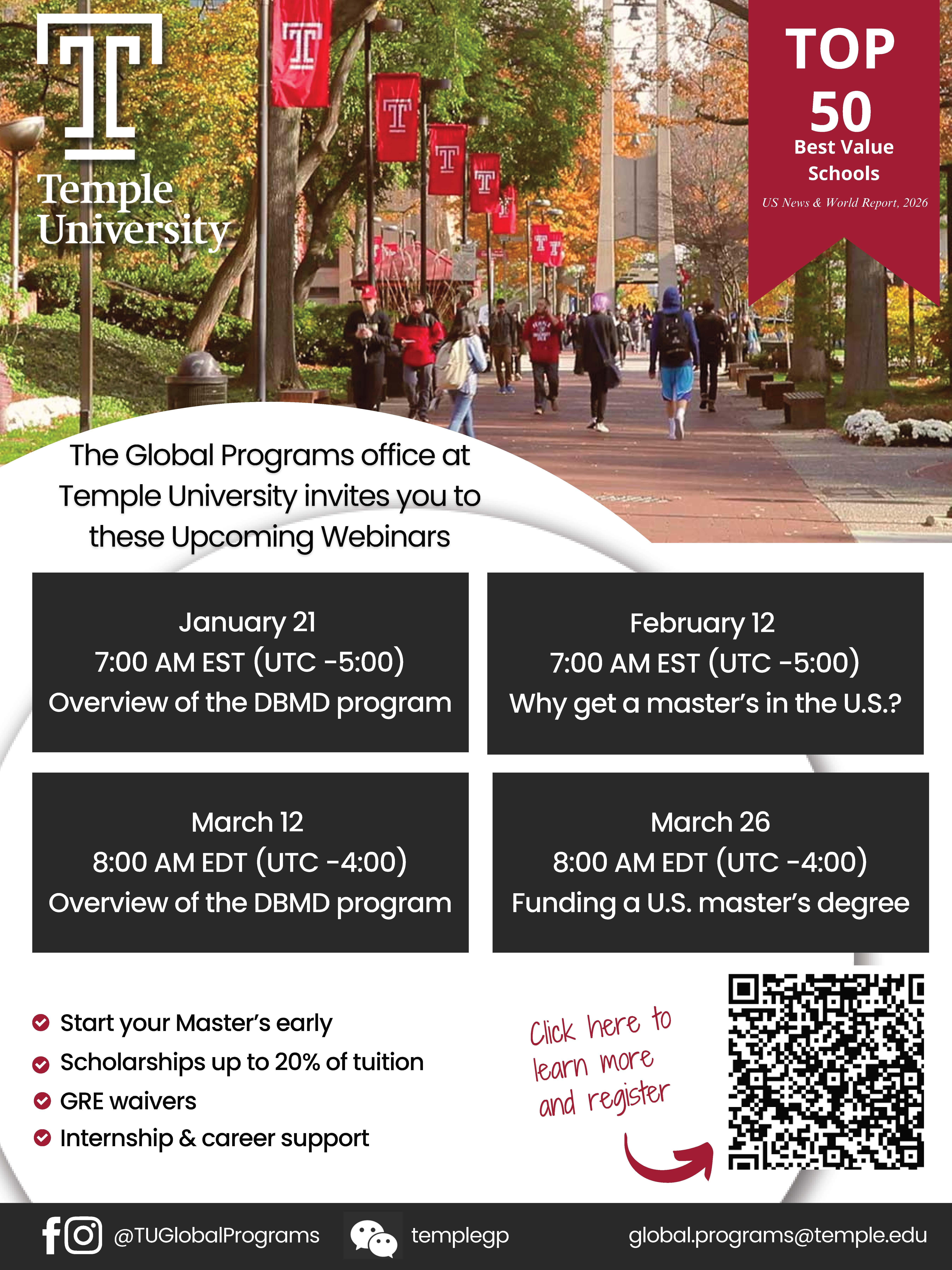This session is designed for students at Temple's DBMD partner institutions who want a clear, realistic understanding of how U.S. master’s degrees are funded. We’ll explore tuition structures, scholarships, assistantships, institutional funding, and personal financing strategies—along with how DBMD and partner universities support students in planning for graduate study in the U.S.