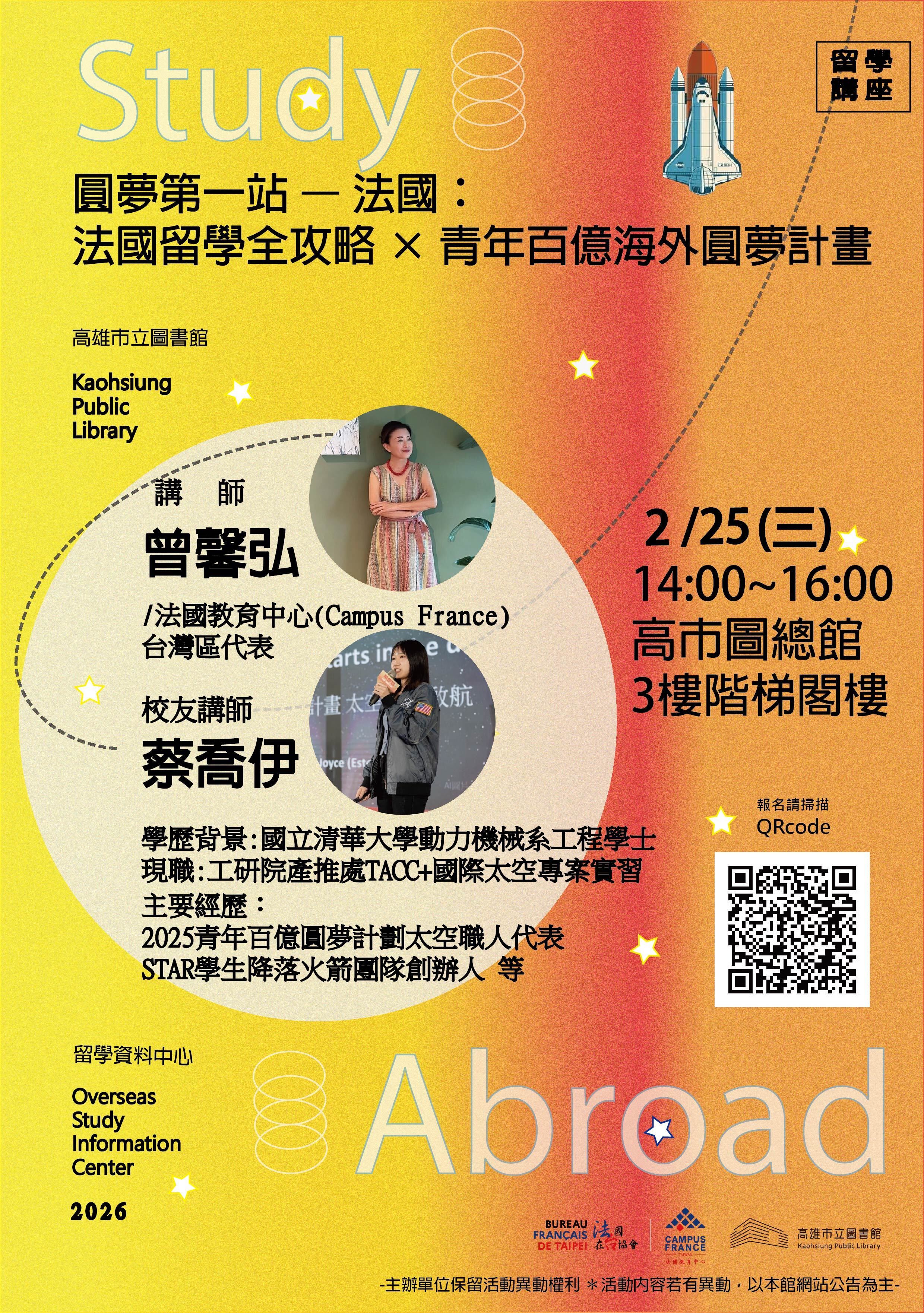 2026年度第一場高雄場次的留法說明會即將在2/25(三)14:00〜16:00於高雄市立圖書館總館舉辦。