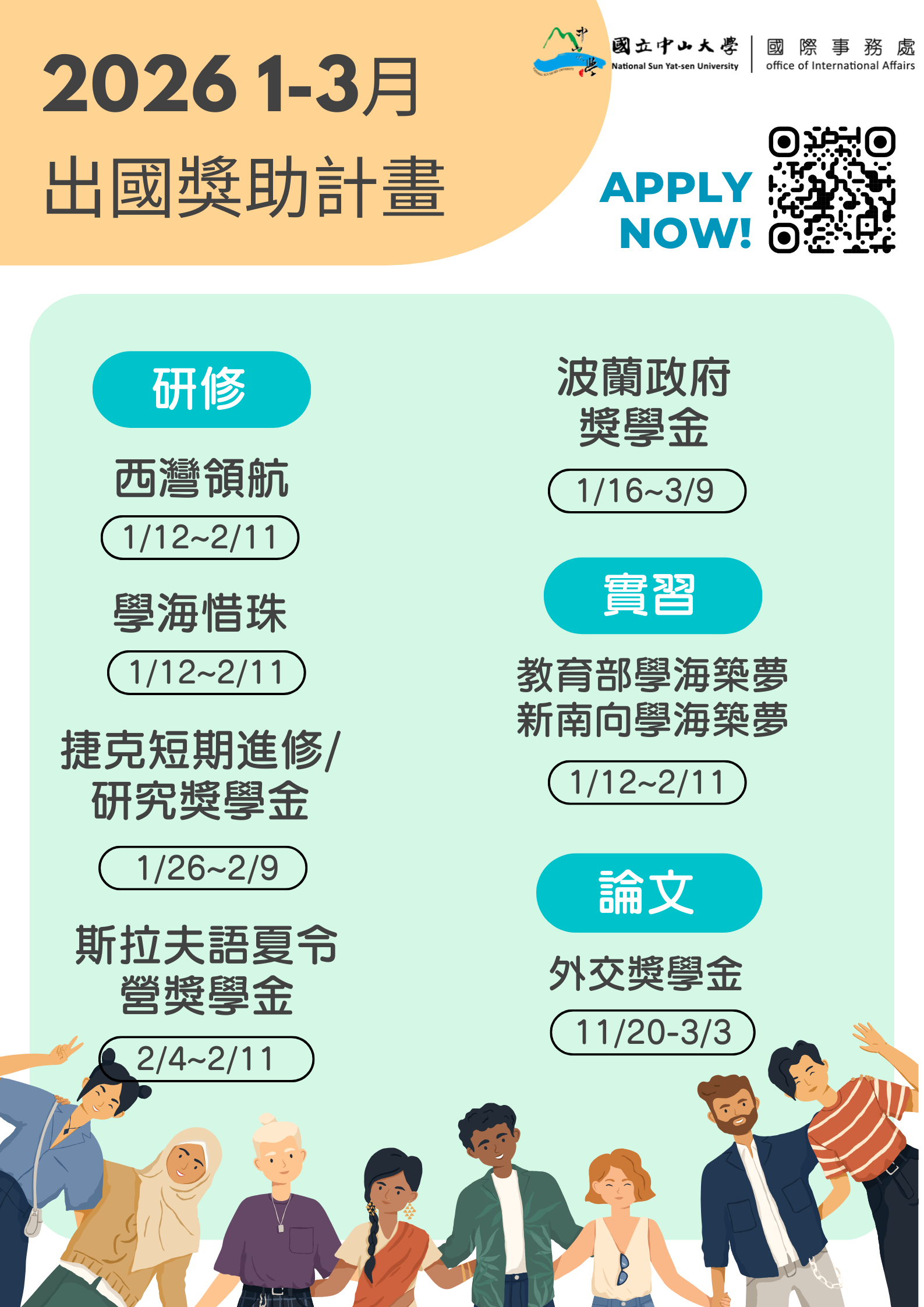 2026年1~3月出國研修獎助計畫刻正申請中,歡迎踴躍提出申請!