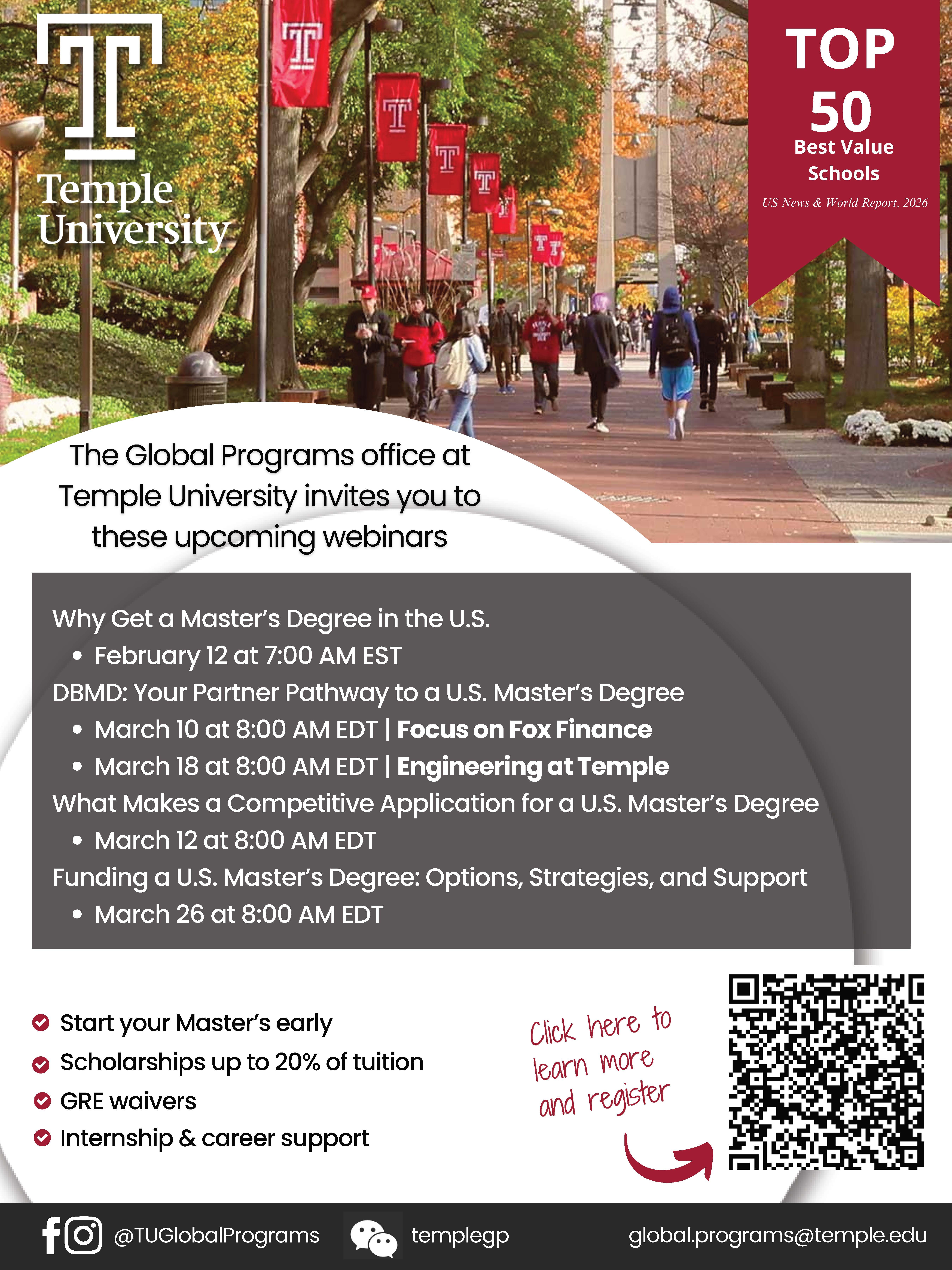 This session is designed for students at Temple's DBMD partner institutions who want a clear, realistic understanding of how U.S. master’s degrees are funded. We’ll explore tuition structures, scholarships, assistantships, institutional funding, and personal financing strategies—along with how DBMD and partner universities support students in planning for graduate study in the U.S.