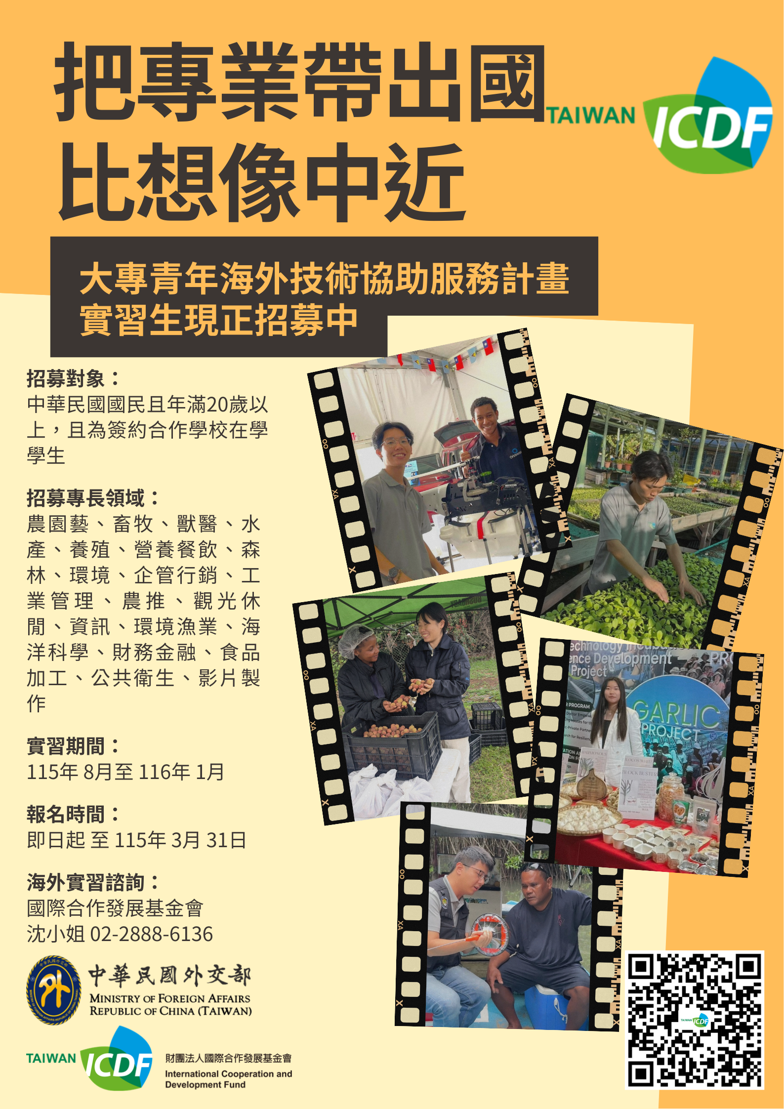 財團法人國際合作發展基金會(國合會)為鼓勵國內大專院校學生瞭解國際合作發展及我國對外技術援助合作現況,規劃「大專青年海外技術協助服務計畫」,提供學生赴國合會駐外技術團海外實習之機會,以培育國際合作發展人才。