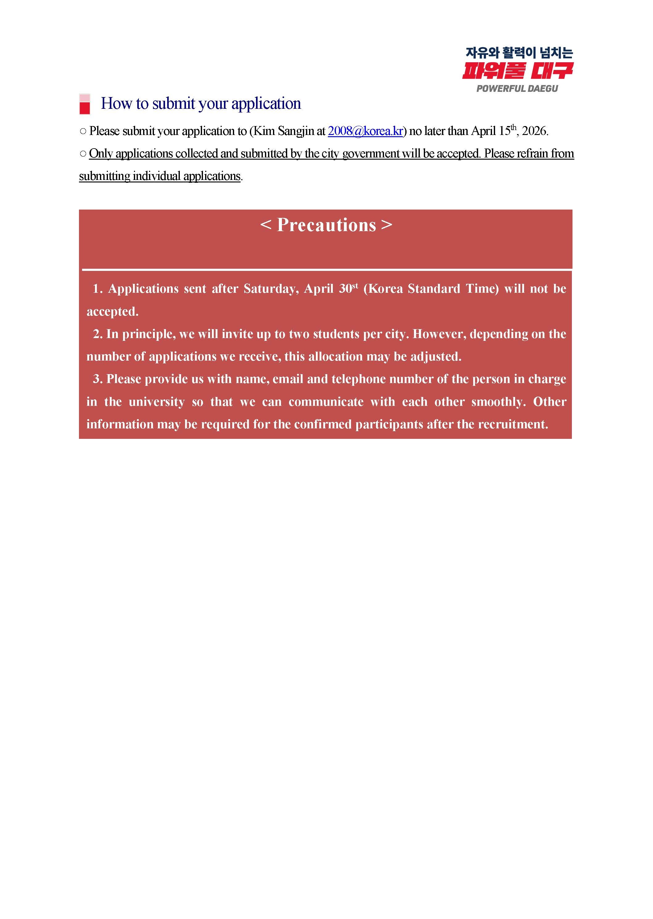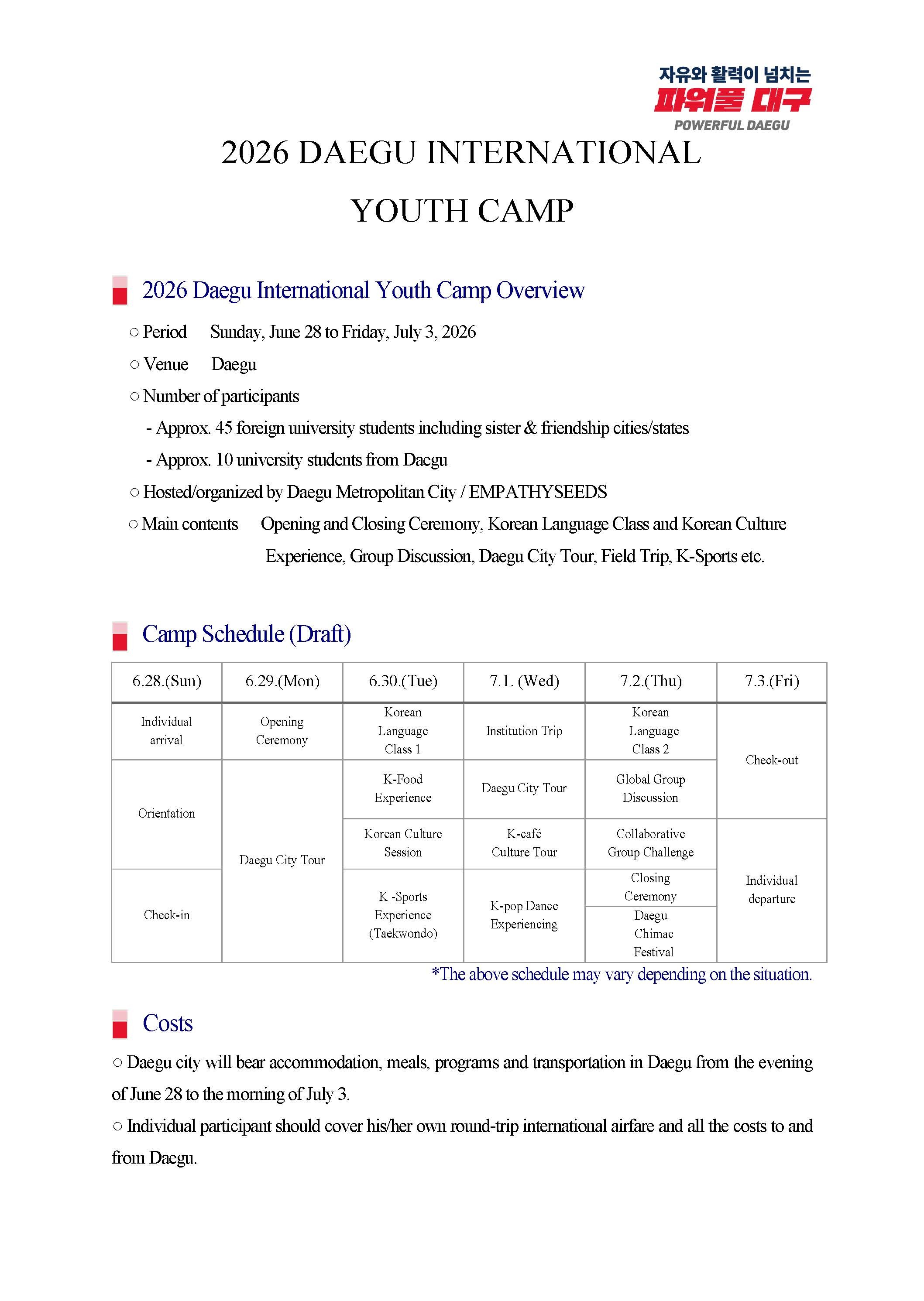 (六)費用:參與學生須自行負擔台灣往返大邱間之交通費用,大邱市政府則提供於當地活動期間之交通及食宿。